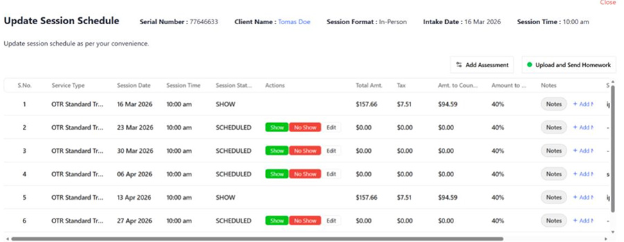 The system allows counsellors to update session dates, mark attendance as Show or No-Show, and automatically calculate session-related financial details such as service totals, tax, and counsellor revenue distribution. This ensures both clinical and administrative workflows remain organized and transparent.