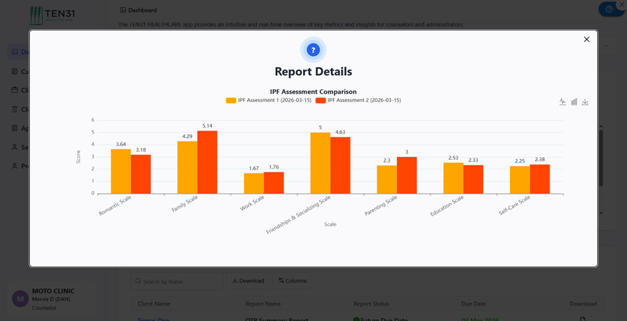 TEN31Healthcare provides clinicians with powerful tools to measure and visualize client progress over time. Through the Assessment Comparison Report, counsellors can easily compare results from multiple assessment periods, helping identify meaningful changes across key areas of a client’s life.