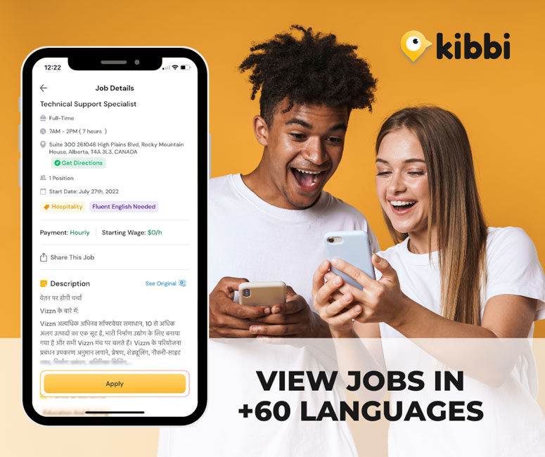 • Kibbi is multi-lingual, making it easy for people of all levels of English proficiency to find jobs. The app allows job seekers to translate job descriptions into more than 60 different languages, and indicates which jobs requires fluent English and which require basic English, so they can find jobs according to their skill levels.