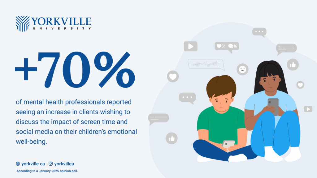 These struggles include navigating both modern and age-old parenting challenges. When asked the top reasons why parents are concerned about their children’s futures, the Yorkville University mental health community rated mental health and affordability/housing as the top fears, with social media habits and bullying a close second. In fact, more than 70 per cent of trainees and practitioners reported seeing an increase in clients wishing to discuss the impact of screen time – TV, Internet, and social media – on their children’s emotional well-being.