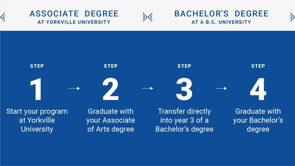 Our Associate of Arts degree is equal to the first two years of a four-year bachelor’s degree. This means you can transfer your credits directly into the third year of various university bachelor’s degree programs and continue specializing in your chosen field. You can learn more about the degree pathway at the BC Transfer Guide.